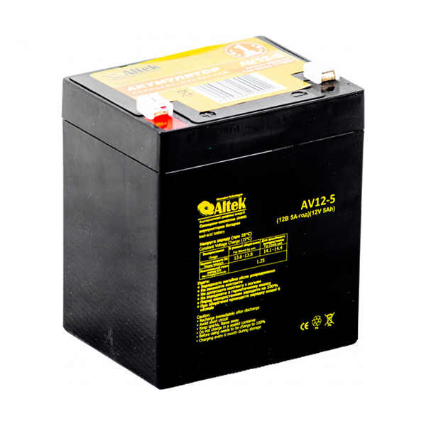 Акумулятор Altek AV12-5 AGM – надійний свинцево-кислотний накопичувач енергії. На відміну від класичних моделей, в акумуляторах AGM електроліт абсорбується сепараторами зі скловолокна. Технологія absorbent glass mat забезпечує кращі конструктивні та експлуатаційні характеристики.