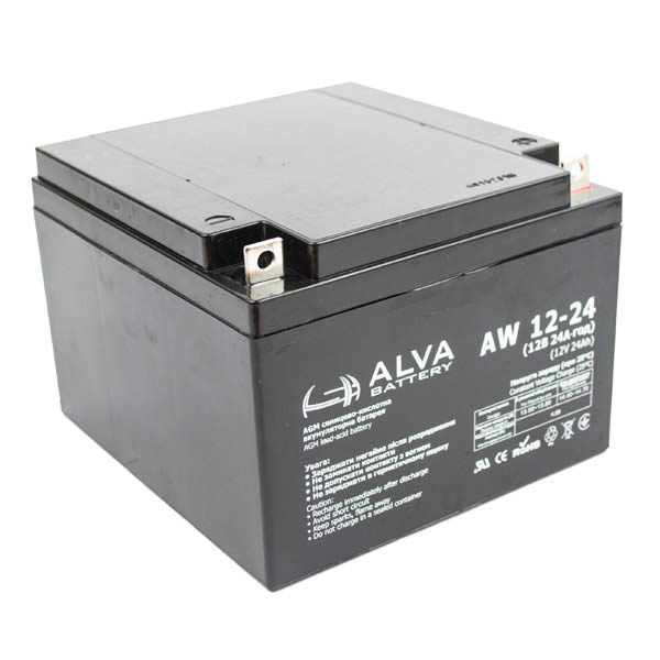 Акумулятор Alva battery AW12-24 – свинцево-кислотна батарея, виготовлена за технологією AGM. Призначена для використання у складі систем резервного живлення. Герметизована конструкція, що не обслуговується, істотно знижує пошкодження корозією клем, запобігає витоку електроліту, допускає встановлення в якому-небудь положенні, крім догори дном.